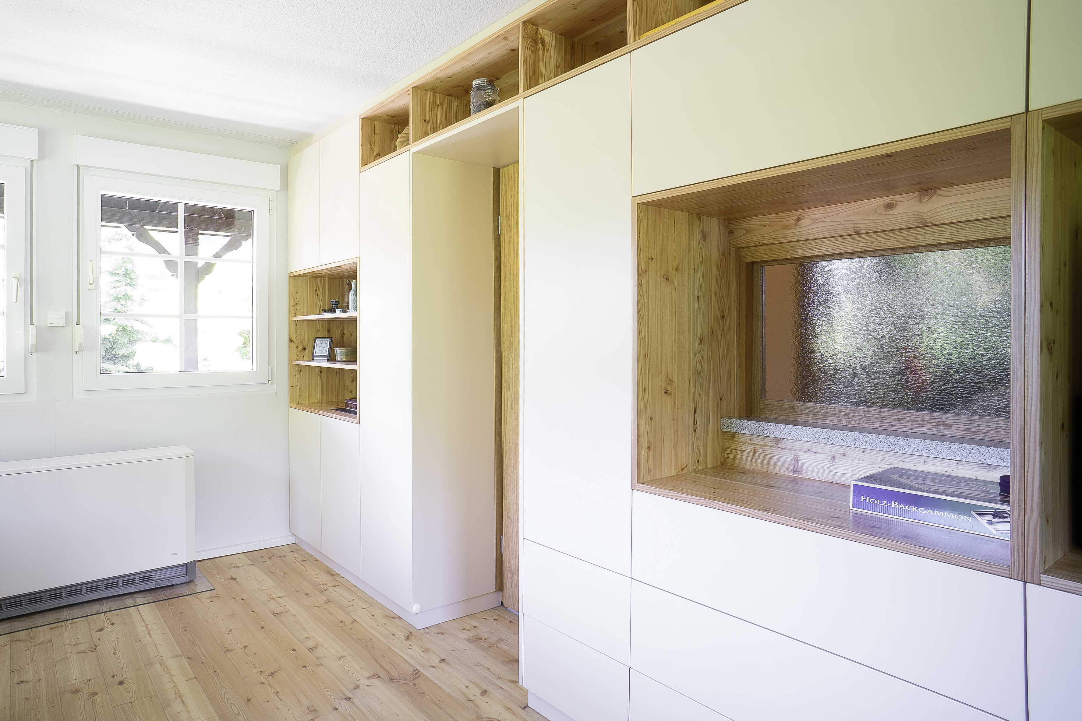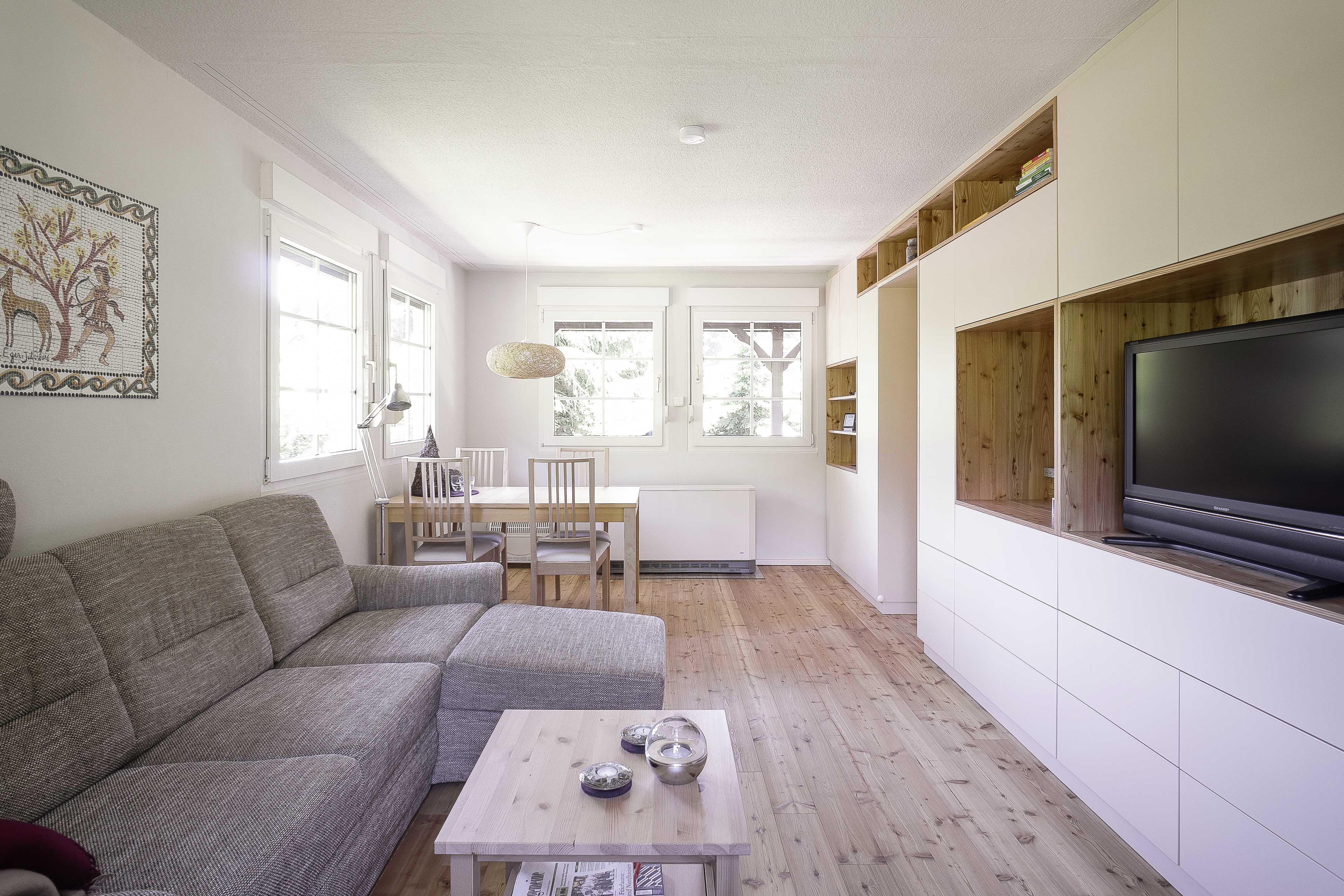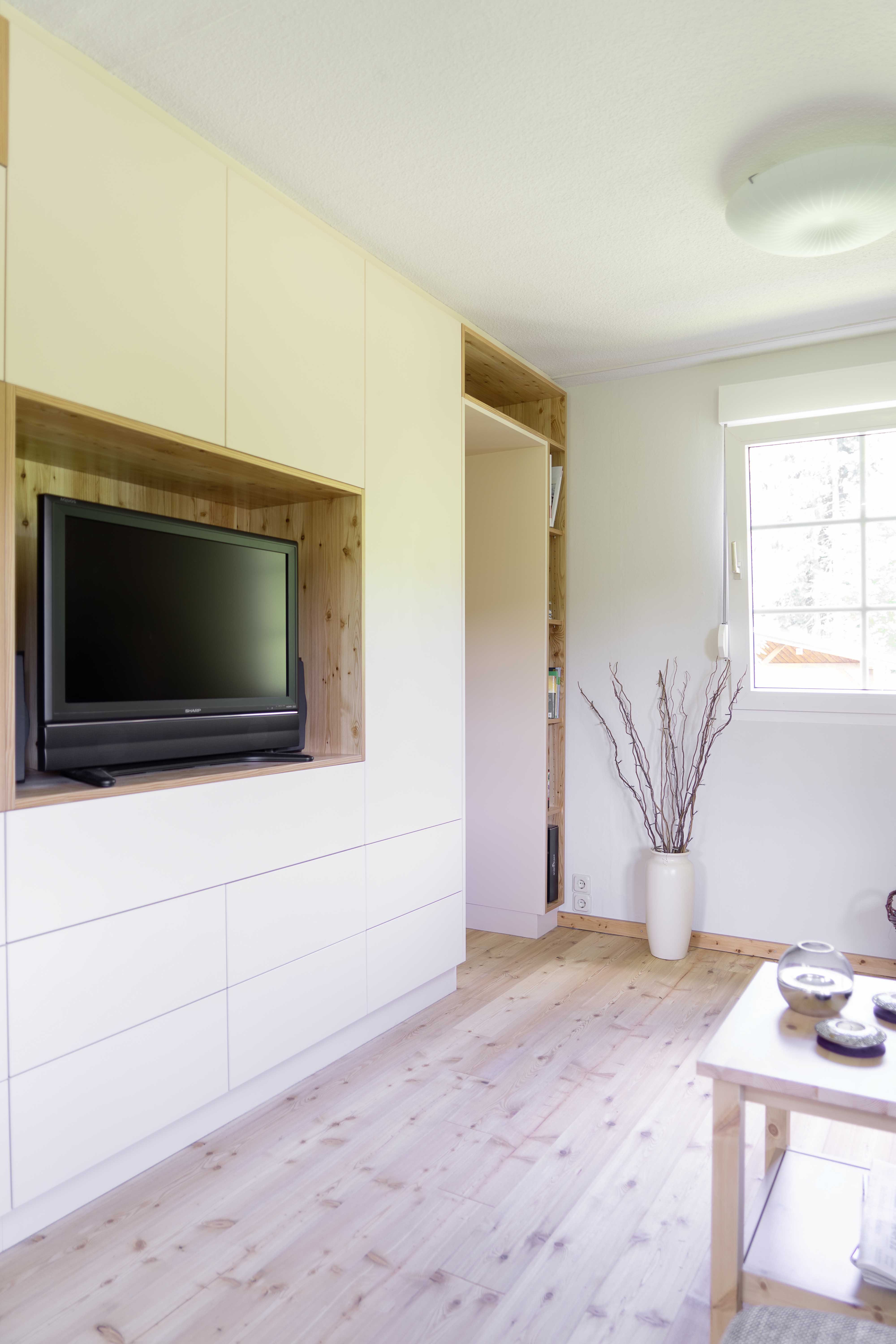 Ein kleines Ferienhaus: Flur, Bad, Küche, Schlafzimmer - jedes Zimmer groß genug, um sich einmal um die eigene Achse zu drehen, da bleibt nur noch das Wohnzimmer um genügend Stauraum zu schaffen. Damit nicht alles mit Möbeln zugestellt wird und erdrückend wirkt, wird eine Wand (optisch) durch einen Schrank ersetzt. Alle Gegebenheiten der dahinterliegenden Wand werden auf den Schrank übertragen: Durchgänge, Durchreiche, TV-Anschluss/Position,...und automatisch entsteht eine funktionale und dekorative Wohnwand.