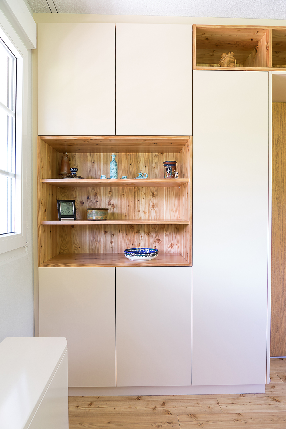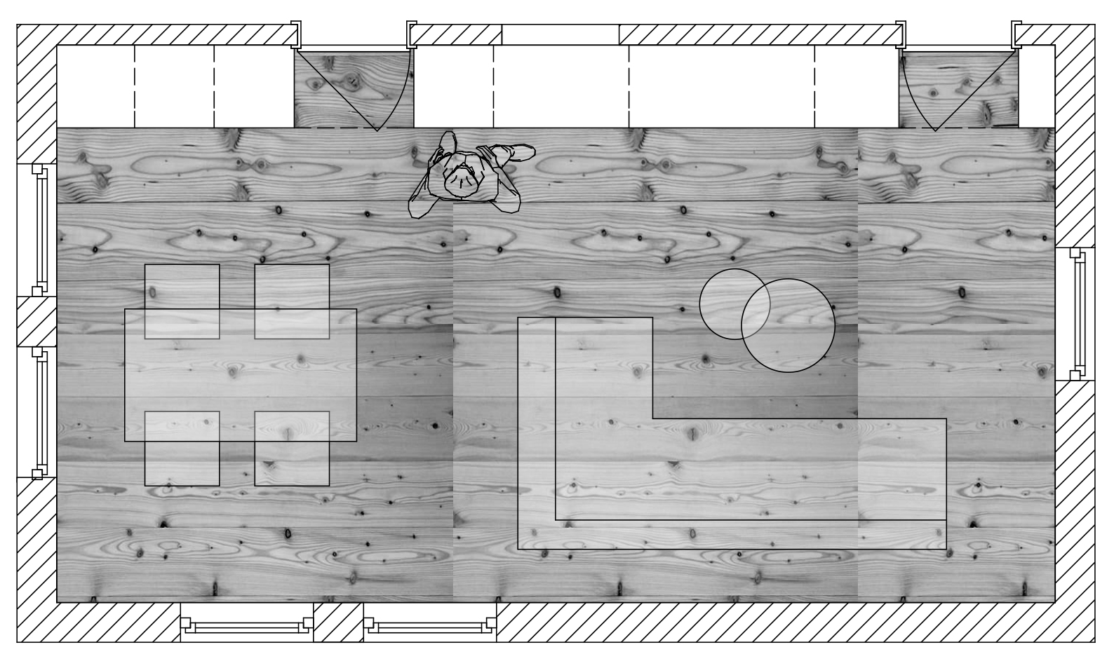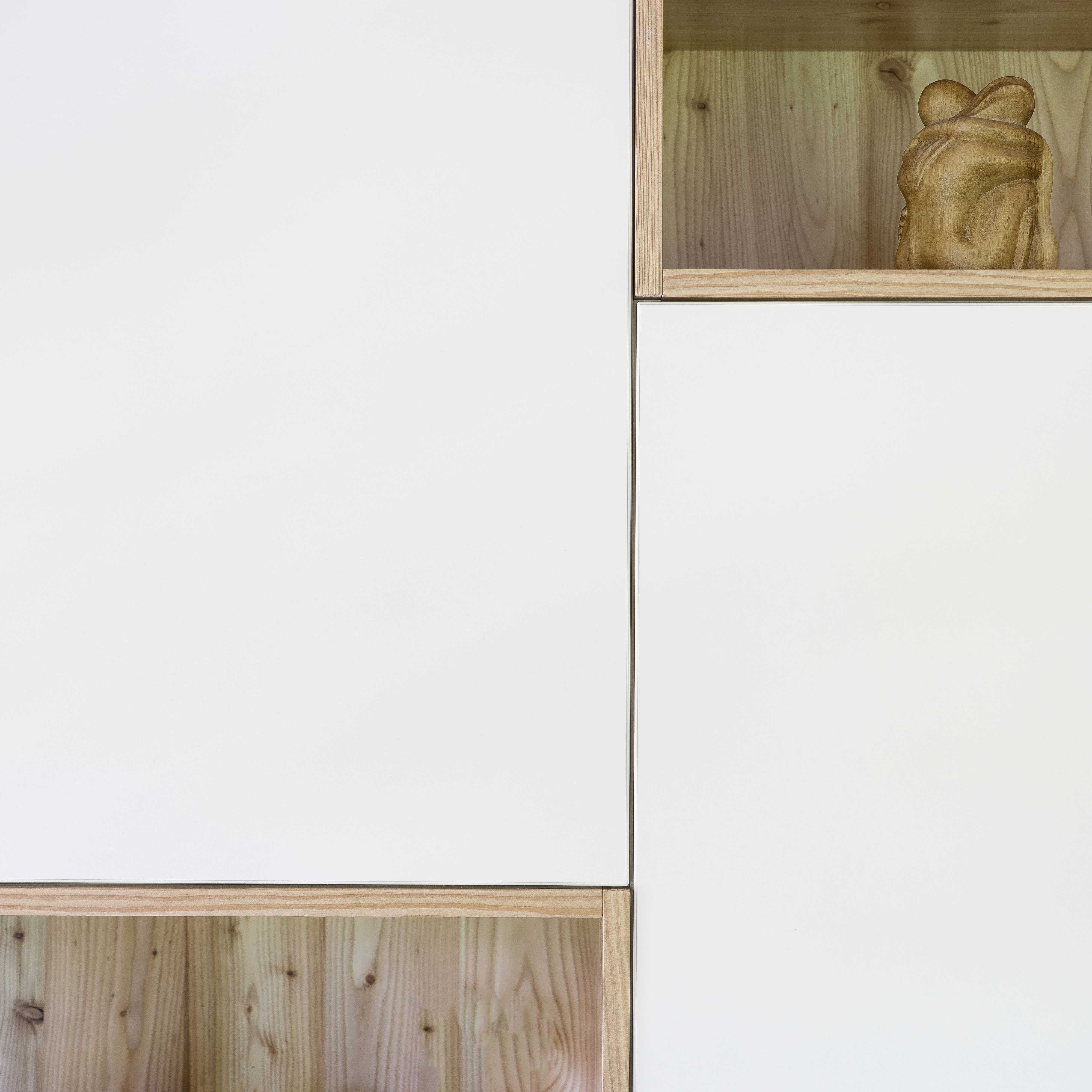 Ein kleines Ferienhaus: Flur, Bad, Küche, Schlafzimmer - jedes Zimmer groß genug, um sich einmal um die eigene Achse zu drehen, da bleibt nur noch das Wohnzimmer um genügend Stauraum zu schaffen. Damit nicht alles mit Möbeln zugestellt wird und erdrückend wirkt, wird eine Wand (optisch) durch einen Schrank ersetzt. Alle Gegebenheiten der dahinterliegenden Wand werden auf den Schrank übertragen: Durchgänge, Durchreiche, TV-Anschluss/Position,...und automatisch entsteht eine funktionale und dekorative Wohnwand.