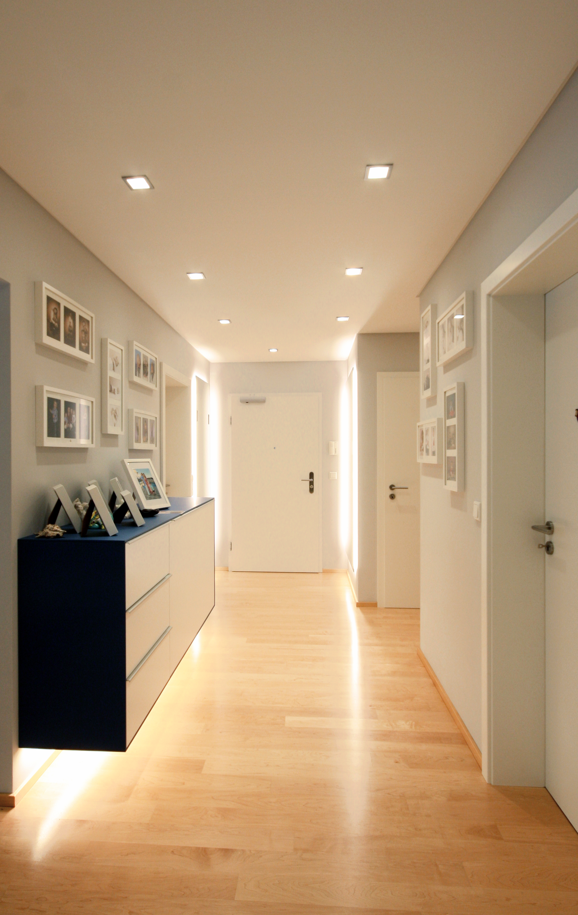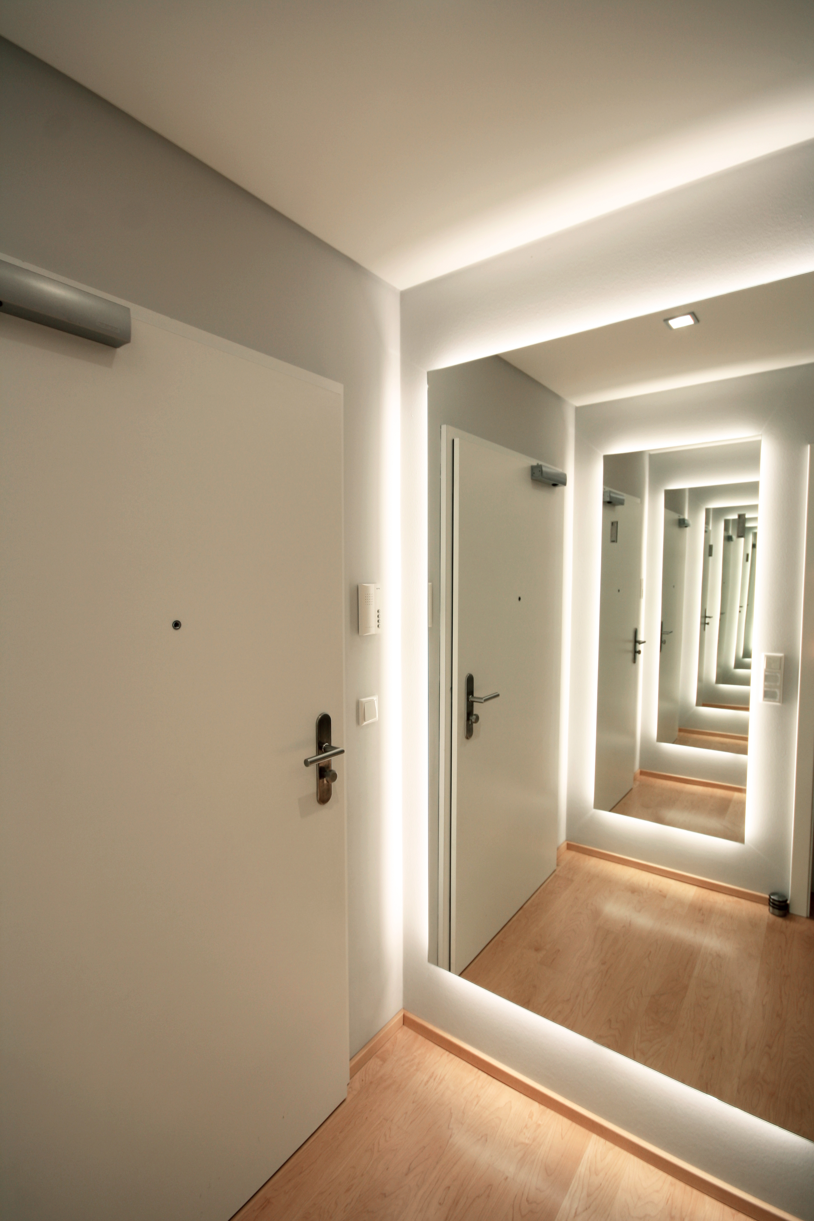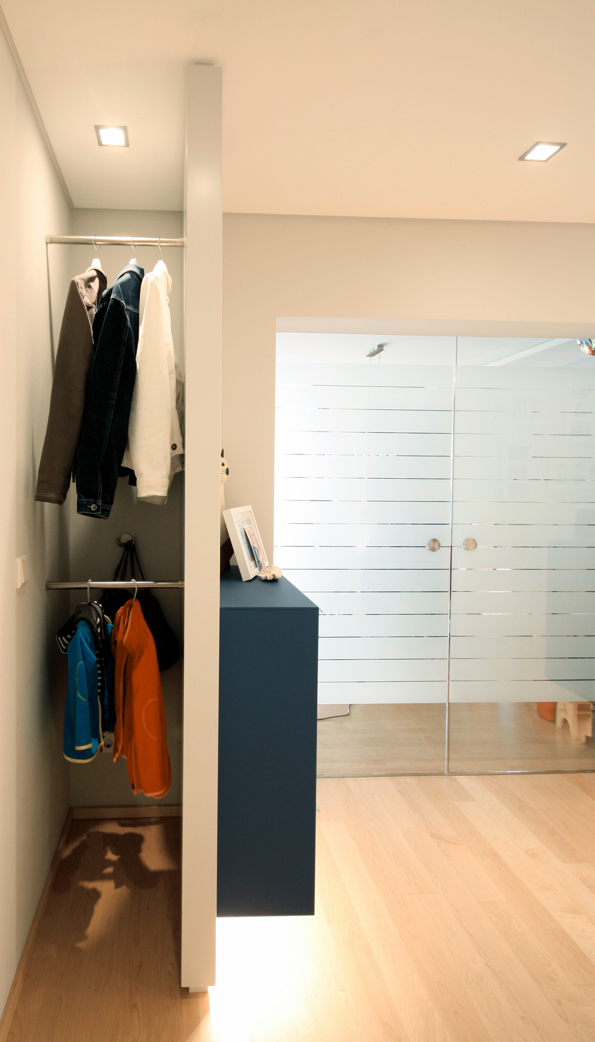 Ein Flur, gemacht für Türen und die enstsprechenden Laufweg von einer Tür zur Anderen. Wo ist da eigentlich Platz für ein Möbel. Größter Herausforderung dabei: Eine Garderobe für Jacken, die mit einem Bügel gehangen werden, aber nicht direkt im Raum stehen soll. Sie soll nicht den Weg blockieren und vom Gast als erstes gesehen werden. Weitere Aufgabe: Licht in einen Flur ohne Tageslicht zu bringen. Es sollte strahlen, wenn man den Wohnungseingang betritt.