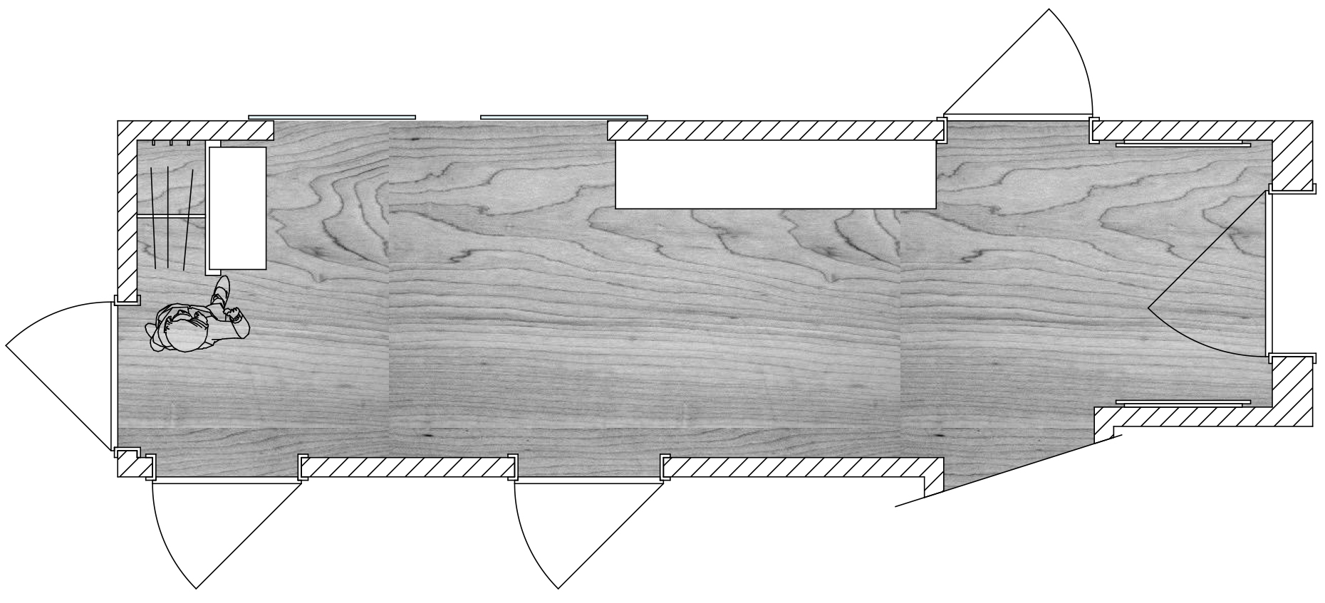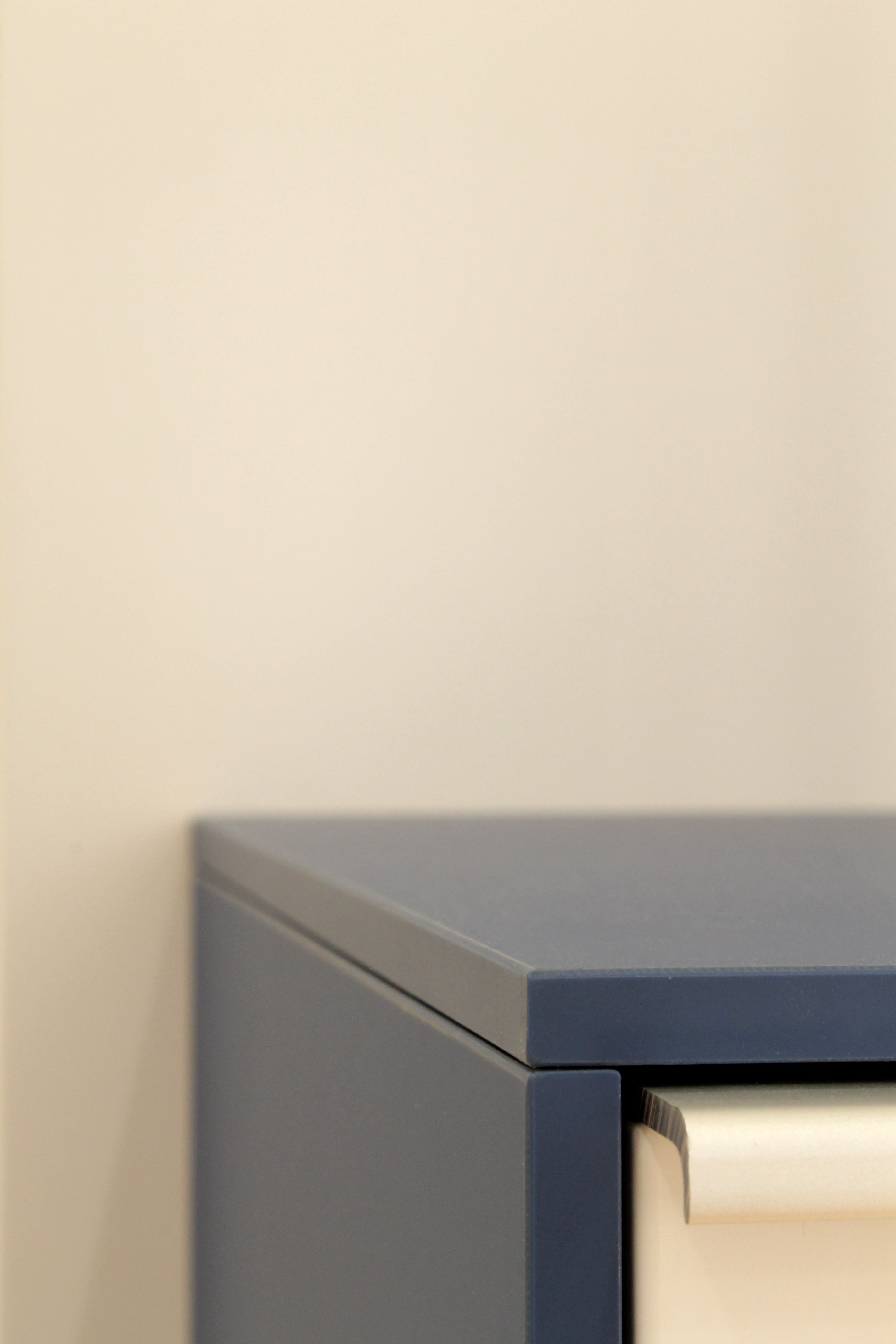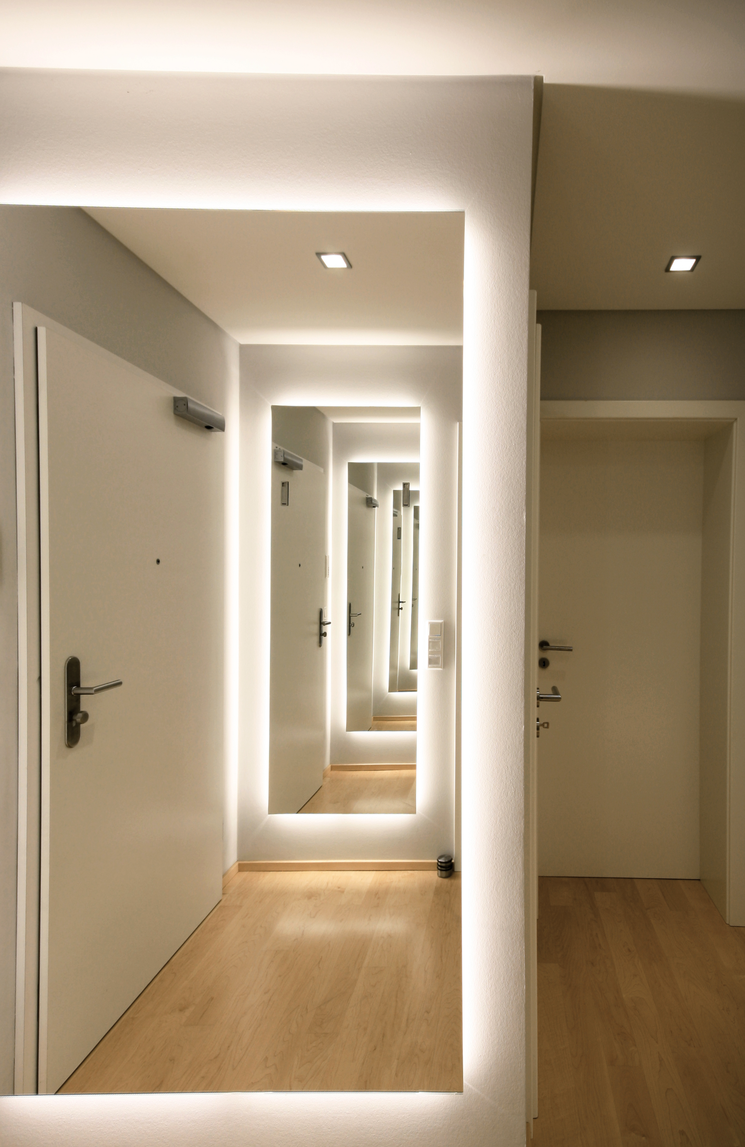 Ein Flur, gemacht für Türen und die enstsprechenden Laufweg von einer Tür zur Anderen. Wo ist da eigentlich Platz für ein Möbel. Größter Herausforderung dabei: Eine Garderobe für Jacken, die mit einem Bügel gehangen werden, aber nicht direkt im Raum stehen soll. Sie soll nicht den Weg blockieren und vom Gast als erstes gesehen werden. Weitere Aufgabe: Licht in einen Flur ohne Tageslicht zu bringen. Es sollte strahlen, wenn man den Wohnungseingang betritt.